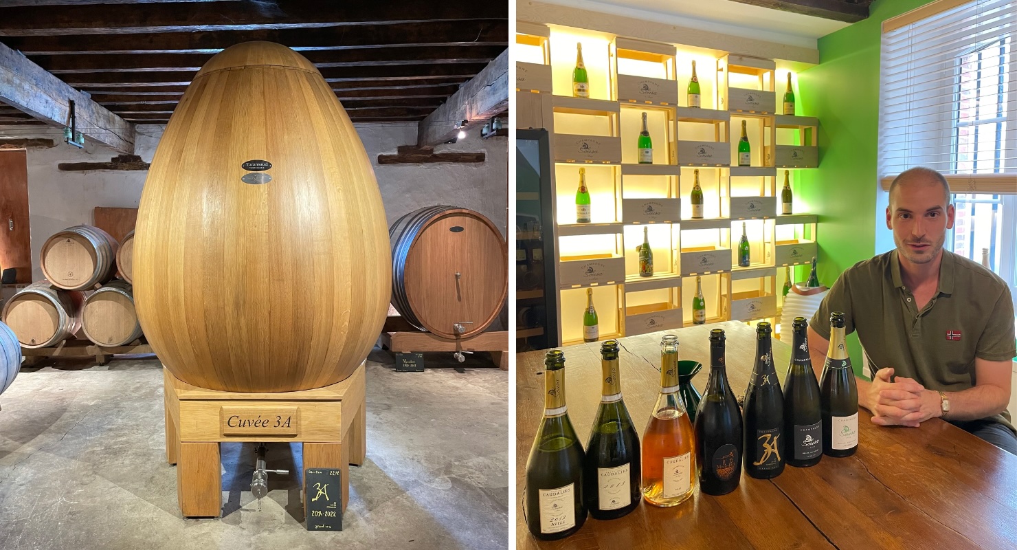 Left: A picket egg-shaped cask used to assemble Champagne De Sousa’s Cuvée 3A, a mix of fifty % chardonnay and 50 % pinot noir. | Proper: Champagne De Sousa winemaker Valentin De Sousa with an array of their biodynamically grown wines.