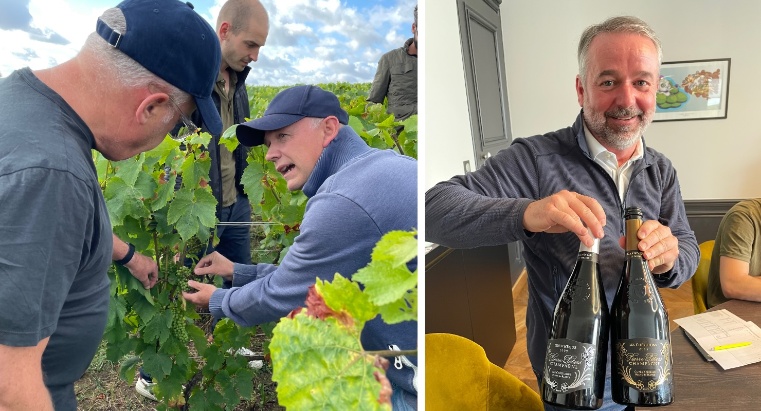 Left: James (left) and Pierre Amillet (proper) of Champagne Robert Moncuit look at chardonnay vines within the Chetillon winery. | Proper: Rodolphe Peters of Champagne Pierre Peters with a few his Chetillon bottlings.
